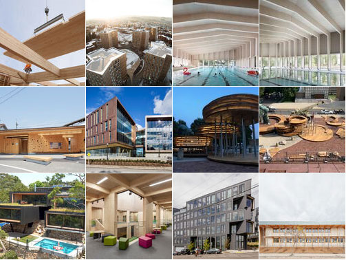 No entanto, um ano antes da revelação do Sorriso, construído em CLT, os arquitetos da Hawkins/Brown já haviam começado a explorar a capacidade estrutural do CLT com o The Cube, um bloco de apartamentos de dez pavimentos em Hackney, Londres. No edifício, "os painéis CLT são colocados em uma estrutura de aço, reforçando-a para ser parte da estrutura", explica Hawkins/Brown. Na mesma época, o objetivo principal da Albina Yard em Portland, EUA, projetado pela LEVER Architecture, era construir o primeiro edifício americano em CLT, e promover o uso da madeira doméstica combinada a uma estrutura de madeira laminada com painéis CLT. Mais recentemente, a Instalação Mass is More da IAAC + Bauhaus Earth faz referência ao Pavilhão Alemão de Mies van der Rohe na Exposição de Barcelona de 1929, refletindo a grade formal do pavilhão original, utilizando CLT.