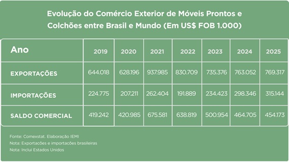 Evolução do Comércio Exterior de Móveis Prontos e Colchões entre Brasil e Mundo (em US$ FOB 1.000) 2019 a 2025