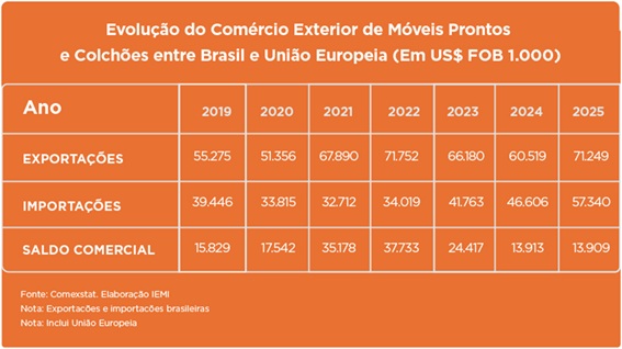 Evolução do Comércio Exterior de Móveis Prontos e Colchões entre Brasil e União Europeias (em US$ FOB 1.000)